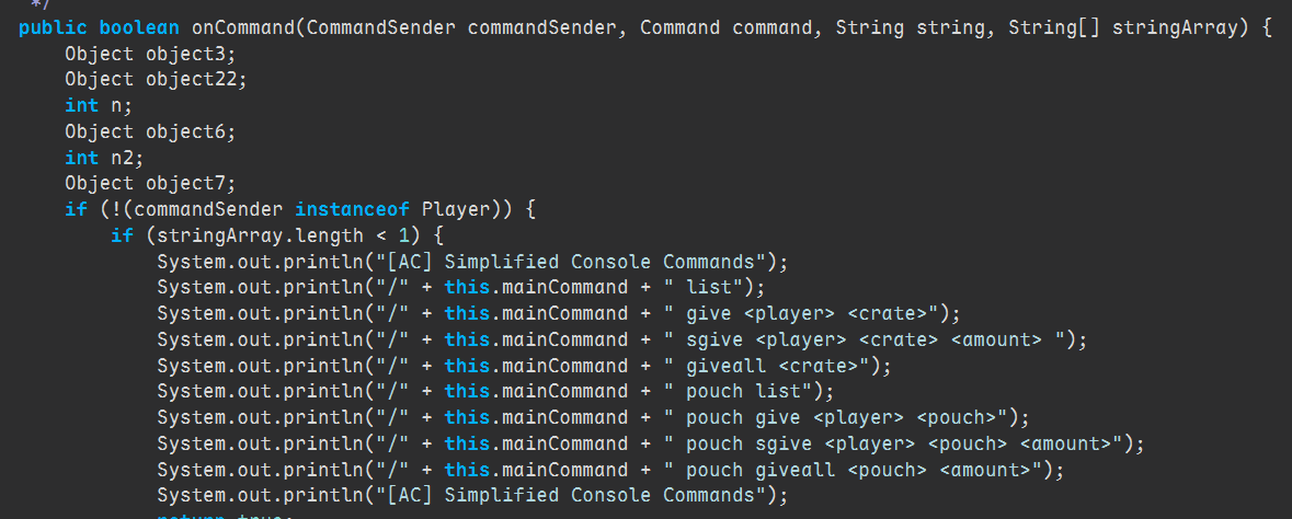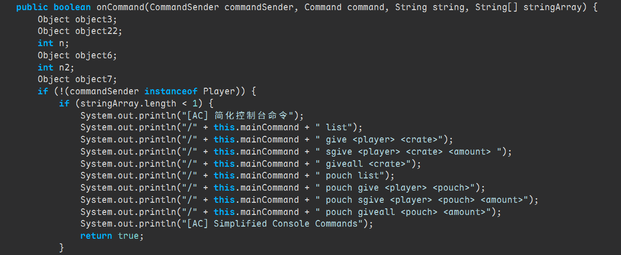打开文件后,鼠标点击展开类,双击打开类文件,右侧会显示出反编译得到的插件代码。以 AdvancedCrates 为例,打开 Recaf 后,定位到需要汉化的字符串位置。